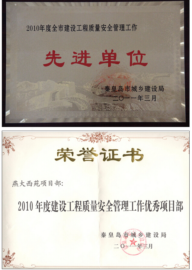 2011年3月8日,秦皇島市城鄉(xiāng)建設(shè)局召開2010年度全市建設(shè)工程質(zhì)量安全管理工作先進單位和先進個人表彰大會:第三工程公司獲2010年度秦皇島市建設(shè)工程質(zhì)量安全管理工作先進單位;燕大西苑三標(biāo)段項目部獲優(yōu)秀項目部;燕大西苑三標(biāo)段項目經(jīng)理楊禮虎獲優(yōu)秀項目經(jīng)理。