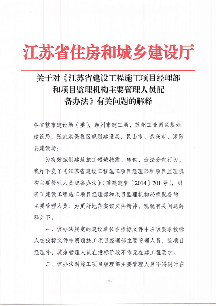 附件:關(guān)于對(duì)《江蘇省建設(shè)工程施工項(xiàng)目經(jīng)理部和項(xiàng)目監(jiān)理機(jī)構(gòu)主要管理人員配備辦法》有關(guān)問(wèn)題的解釋